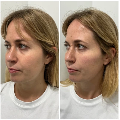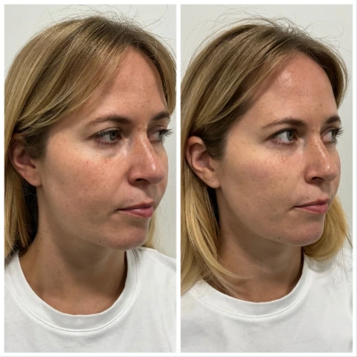 The support her skin received from the fillers helped reduce shadowing in the under-eye hollows, and thanks to a gentle lift in the cheeks, her overall expression naturally brightened. From the images below, you’ll see that the result wasn’t a brand new look or dramatically altered face – it was simply everything coming together to achieve a more rested, balanced appearance.